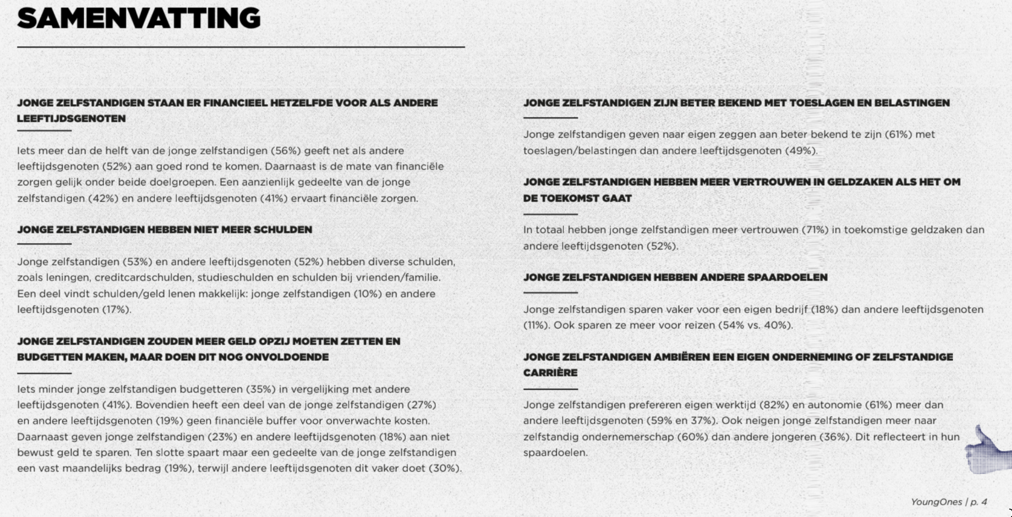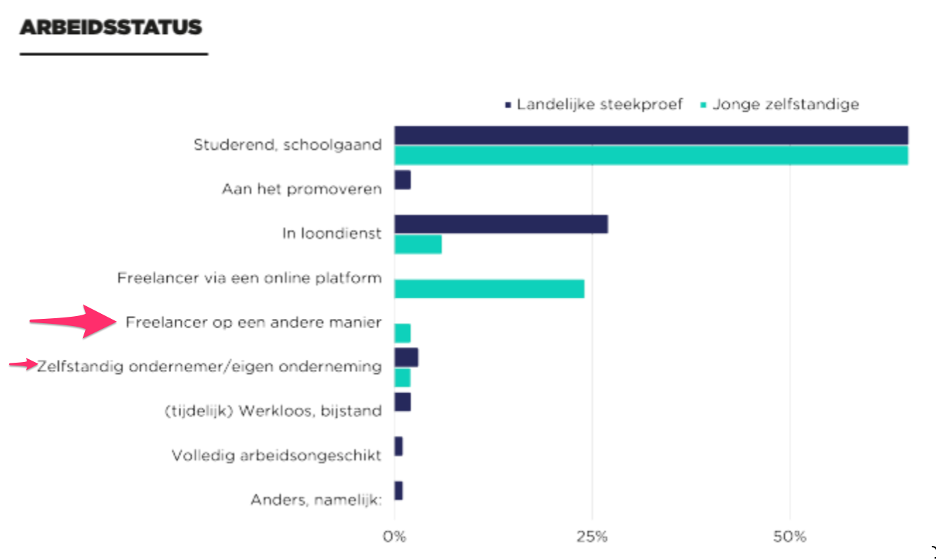 "De doelgroep in dit onderzoek bestaat uit jongeren die zijn aangesloten bij het platform YoungOnes van 18 tot 25 jaar en een representatieve steekproef van jongeren (excl. freelancers) in dezelfde leeftijdscategorie."