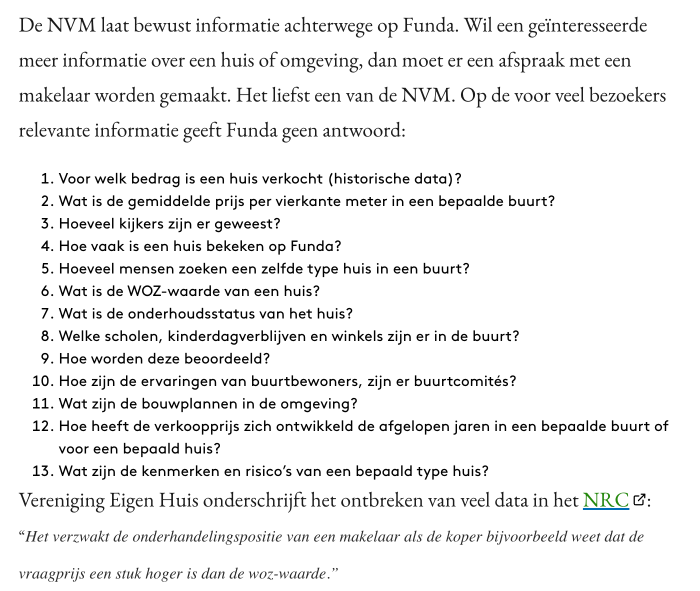 Funda had een lange tijd naast de NVM en een groep 'founding partners' ook een aandeelhouder buiten de sector: Wegener Media. In 2013 verkoopt Wegener Media de aandelen aan de NVM, die het platform ziet als een strategisch instrument. De gehele geschiedenis van Funda en de conflicten rondom het platform zijn mooi omschreven in het artikel 'Funda en de wurggreep van de NVM', geschreven door onderzoeksjournalist Bas Vermond. Hier een fragment over wat het platform jou als geïnteresseerde NIET meldt: