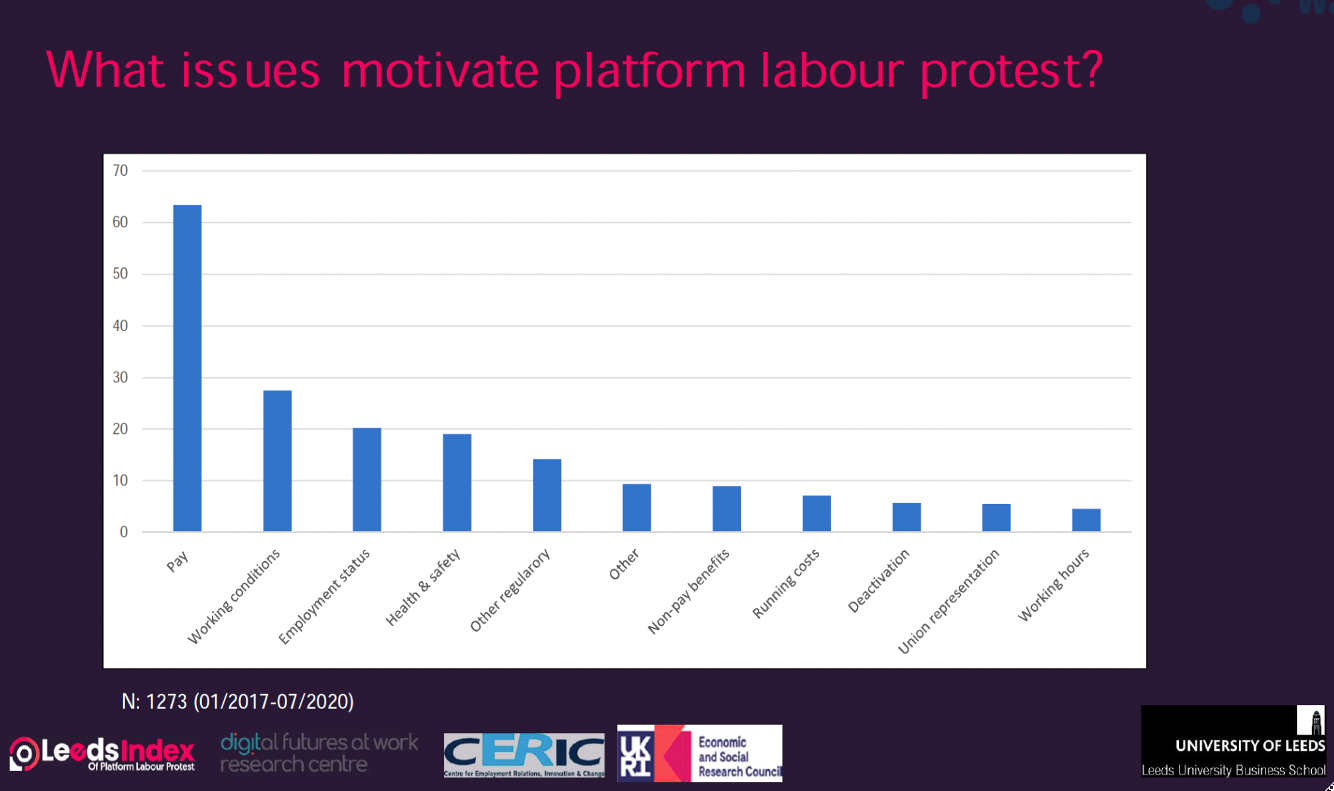 Besides the issue of transparency (it is questionable to what extent dynamic tariffs for work are at all desirable), there is no debate on the level of compensation a worker should receive for the service provided. A topic that is ranked number one when you look at what platform workers are taking to the streets worldwide for, according to earlier research by Leeds University.