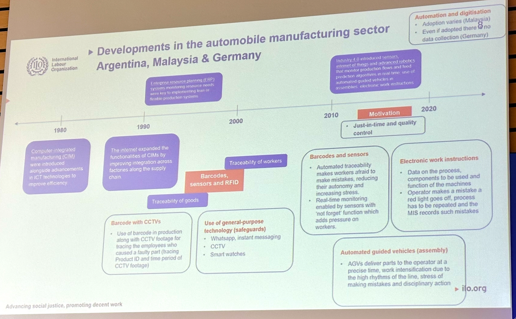 Also at the conference in Leuven, the call to look at what is really new was highlighted by Uma Rani of the International Labour Organisation (ILO), among others. She brought an interesting overview of a historical perspective of the use of technology in the context of work and also showed that sometimes the technology itself does not change, but the way it is applied does. This was also discussed by her ILO colleague Annarosa Pesole.