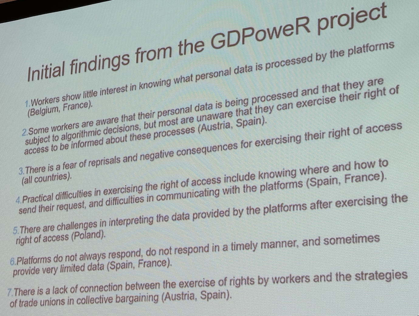 With all the attention around new regulations, you would almost forget that there is already a lot of regulation that working platforms already have to comply with. During the session ‘Representing workers rights in the platform economy’, among others, this was emphasised several times. This session was mainly about the upcoming Platformwork Directive, but also explicitly about GDPR. Since many platform workers are not employees, they are also not protected under employment law, making AVG for rights relating to data suddenly very interesting. (note: I am not a lawyer) For example, María Luz Rodríguez Fernández presented the GDPoweR project, which , according to its own website, ‘explores what worker data is collected by platform companies and how this affects workers, what strategies are used by social partners to negotiate and implement collective agreements and how the implementation of such agreements can be monitored and enforced. A central method used is the recovery of worker data through GDPR requests and the joint analysis of this data by workers and researchers.’ The slides below summarise the initial findings.