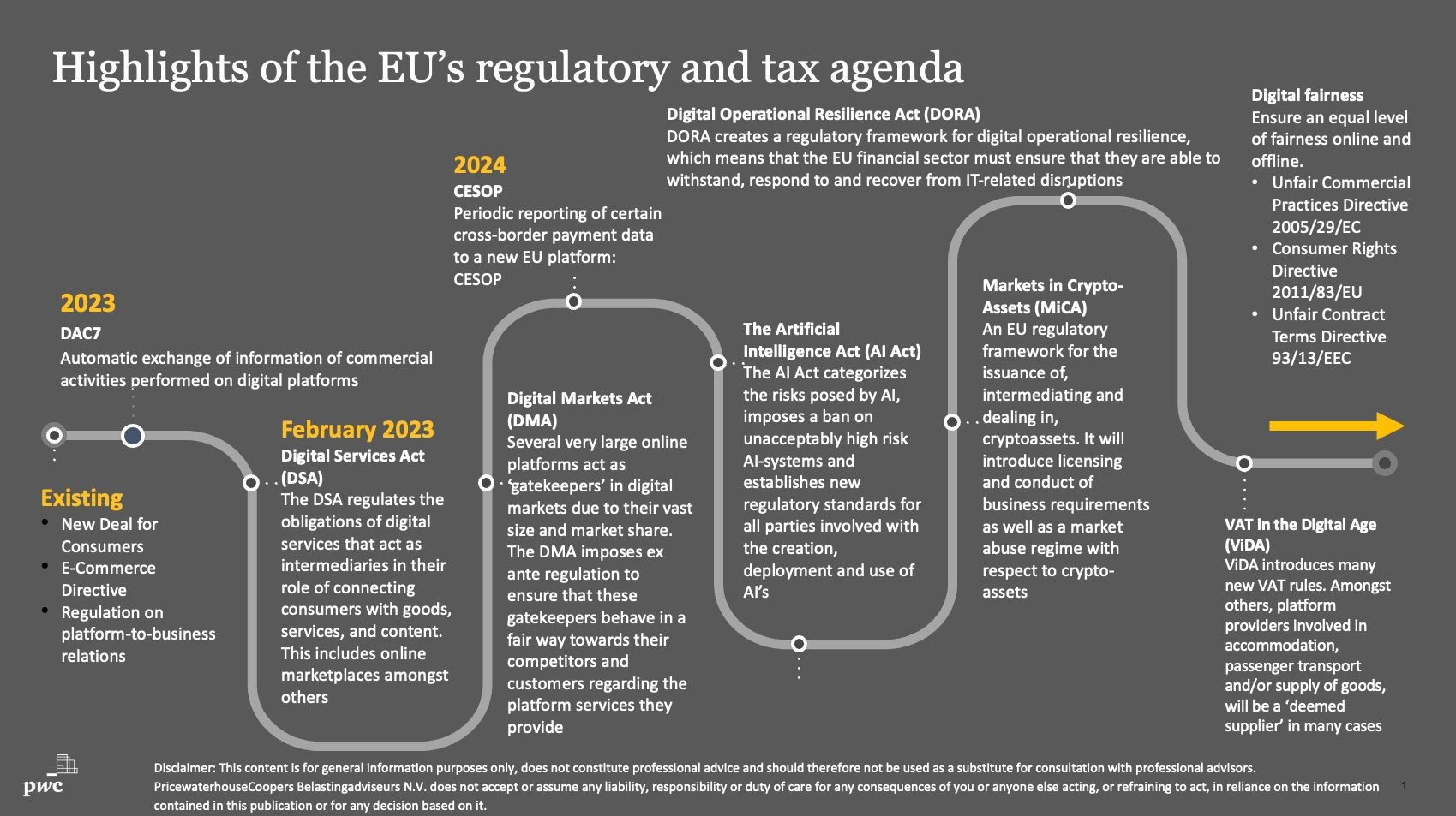 To ensure that European legislation remains up to date, the European Commission under President Von der Leyen introduced the strategy 'A Europe fit for the digital age'. Under this strategy, several laws that have entered into force or will soon enter into force in the past year have been worked on, such as the Digital Services Act (DSA), Digital Markets Act (DMA), the DAC7 and VAT in the Digital Age (ViDA).