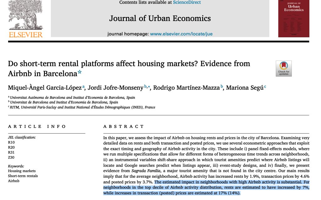 Ik ben benieuwd of er onderzoekers zijn die deze keuzes van gemeenten en de impact op de lokale samenleving en economie gaan monitoren. Rondom deze discussie kwam ik een interessant artikel tegen "Do short-term rental platforms affect housing markets? Evidence from Airbnb in Barcelona". Het paper:
