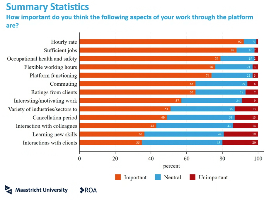 Welke aspecten van platformwerk vinden freelancers belangrijk? Op één staat 'het uurtarief' (92%), op twee 'genoeg aanbod van werk' (88%) en op drie 'gezondheid en veiligheid' (79%). Ook 'flexibele uren' (76%), 'het functioneren van het platform' (74%), 'reistijd' (65%) en 'beoordelingen van klanten' (65%) zijn belangrijk. Minder relevant zijn 'interactie met klanten' (35%), 'nieuwe skills leren' (36%) en 'contact met collega’s' (43%).