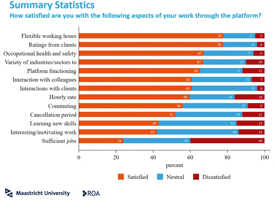 Zoals gezegd vinden freelancers het uurtarief en de beschikbaarheid van voldoende klussen belangrijk. In de praktijk zijn ze daar minder tevreden over. De platformwerkers zijn vooral tevreden over de flexibele werkuren (78%) en klantbeoordelingen (78%). Slechts 60% is tevreden over het tarief en 24% over de hoeveelheid beschikbare klussen. Dat laatste getal kan verklaren waarom freelancers relatief vaak actief zijn op meerdere platformen die hetzelfde type werk aanbieden.
